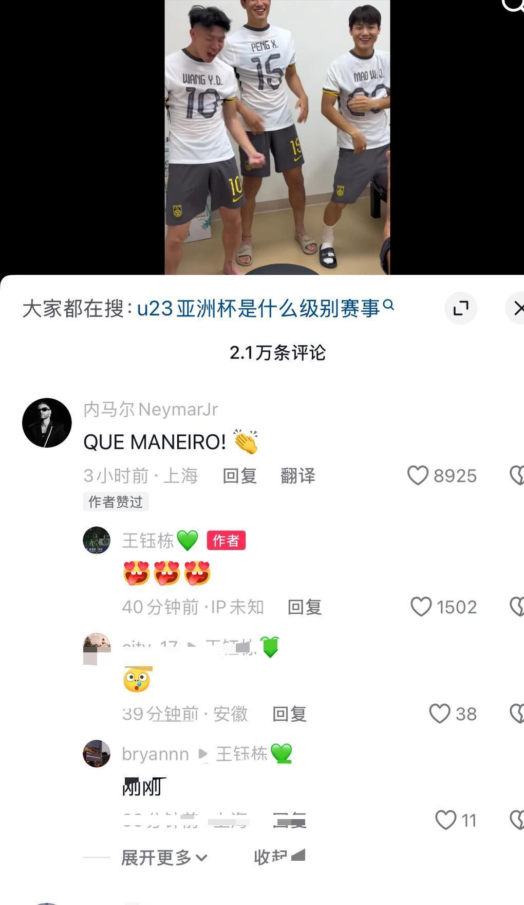 更绝的是,连世界级巨星内马尔都在王钰栋的社交平台留言鼓励。
